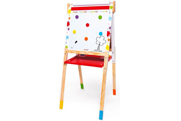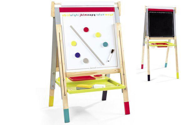 Een schoolbord van Janod die in hoogte verstelbaar is van 91 tot 126 cm. Aan de ene kant zit een magnetisch whiteboard, aan de andere kant een zwart krijtbord. Ook zit er een papierrol aan de bovenkant bevestigd. Het schoolbord is bordeaux/mintgroen van kleur en wordt met de volgende accessoires geleverd: magneten, krijtjes, een uitwisbare stift, een wisser, een magnetische liniaal en een rol papier.